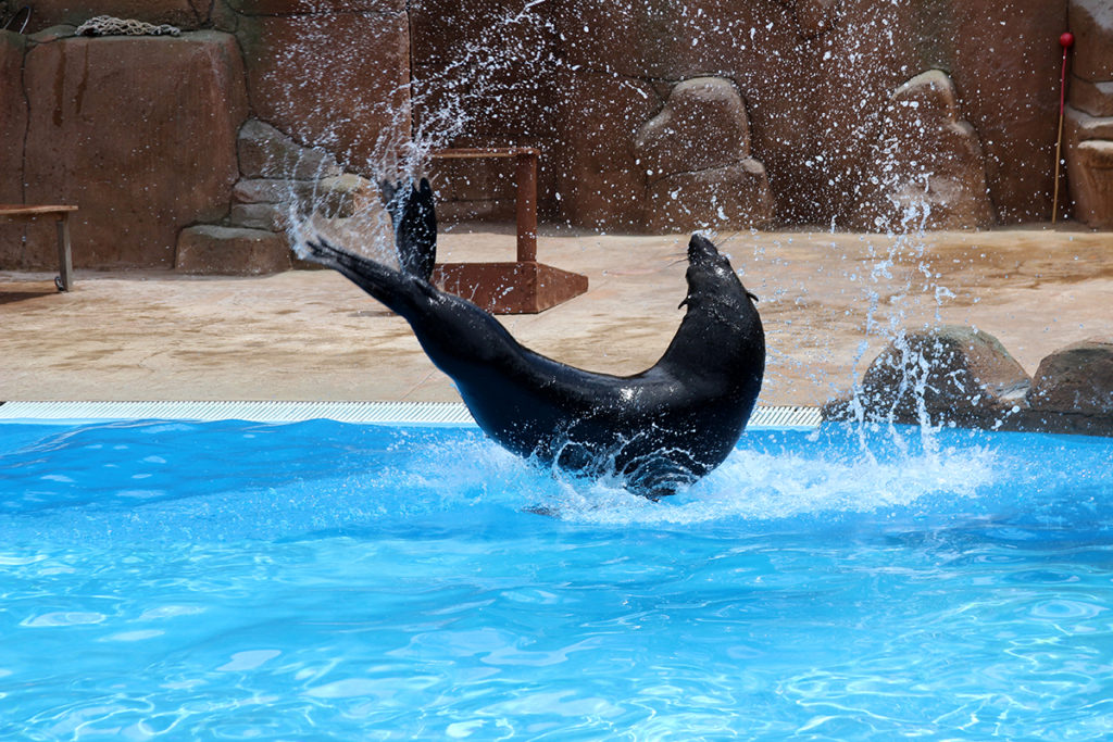 Wir werden gebeten, einen Neoprenanzug anzuziehen. Die Umkleiden sind leider nicht ganz so, wie man sich Umkleiden vorstellt. Keine Kabinen, keine Schließfächer für die Wertsachen, offene Duschen. Fertig angezogen geht’s zum Becken. Es werden alle 12 Teilnehmer gebeten, sich im Wasser am Beckenrand aufzustellen. Dann wird der erste Seelöwe von der Trainerin gerufen. Langsam gleitet er im Wasser an uns vorbei, wir dürfen das Tier das erste Mal berühren. Er zeigt noch ein paar Kunststücke und wird dann wieder in sein Gehege zurückgelassen. Der nächste Seelöwe wird gerufen. Dieser würde anscheinend lieber in seinem Gehege bleiben, denn nach einer kurzen Runde im Wasser, „läuft“ er wieder zur Tür, die zu seinem Gehege führt. Nach ein paar Minuten wird er doch mit einigen Fisch-Leckerlis überzeugt, ein paar Kunststücke mit uns zu machen. Wir dürfen uns mit einem Ring hinstellen, durch den er durchspringt. Bei diesen Aktionen werden wir immer fotografiert und können die Bilder danach kaufen. Der letzte Seelöwe ist dran und darf an alle Teilnehmer Bussis austeilen. Die Schnauze ist ganz kalt wenn er die Wange berührt. Nach ca. 30 Minuten ist die ganze Show vorbei. Zusammengefasst war es ein tolles Erlebnis, aber als „Schwimmen“ mit den Seelöwen würden wir es nicht bezeichnen.